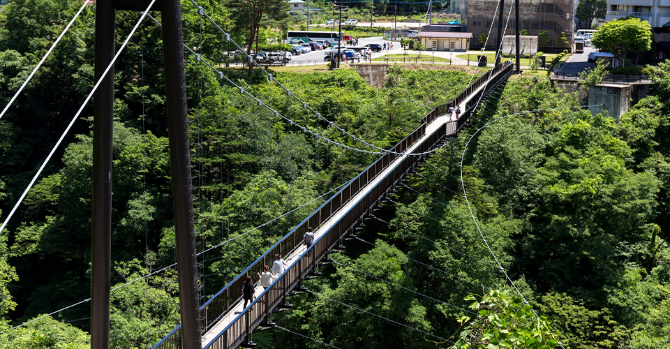鬼怒川にかかる全長約140m、高さ約40mの吊り橋。鬼怒川温泉街から名勝「楯岩(たていわ)」へ無料で渡ることができ、橋上からは鬼怒川と断崖が織り成す渓谷美が楽しめます。例年10月下旬~11月中旬には清流に鮮やかに色づいた木々が映え、紅葉スポットとしても人気です。吊り橋を渡った先にそそり立つのは、高さ約70mの巨大岩「楯岩」。そこから左手に進むと澄んだ水が流れ落ちる「古釜の滝」があり、右手に進むと階段とトンネルの遊歩道が整備されており、頂上まで登ることもできます。頂上にある展望台は、眼下に温泉街を一望し、遠くに鶏頂山などの美しい山並みを見渡せる絶景スポット。日没後は夜景も楽しむことができます。