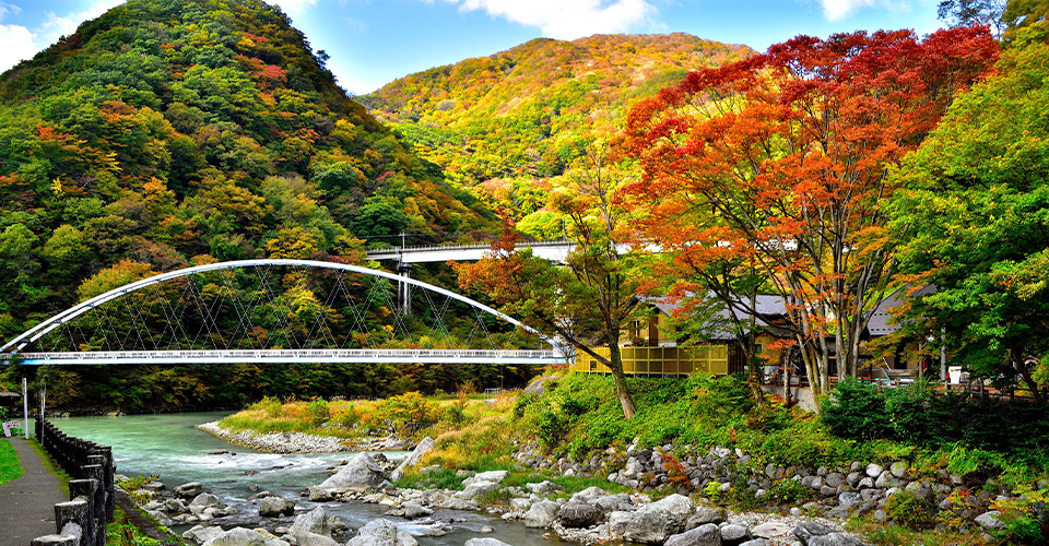 鬼怒川と男鹿川が合流する渓谷沿いにある温泉郷。この地を会津西街道が通っていたことから、江戸時代から宿場町として賑わいました。泉質はアルカリ性単純温泉で、特にケガに効くとされ「傷は川治、火傷は滝(現在の鬼怒川温泉)」といわれ親しまれています。日帰り入浴でぜひ立ち寄りたいのが、共同浴場「薬師の湯」です。露天風呂のぬるめの湯につかれば、目の前を流れる男鹿川の眺めをゆったりと楽しめます。名勝「龍王峡」へ続く遊歩道も整備されているので、ハイキング帰りのひと風呂にも最適です。温泉街の名物は大黒屋製菓店の「温泉まんじゅう」。小ぶりなサイズで、甘すぎない粒あんにモチモチの皮。お土産としても定番の一品です。