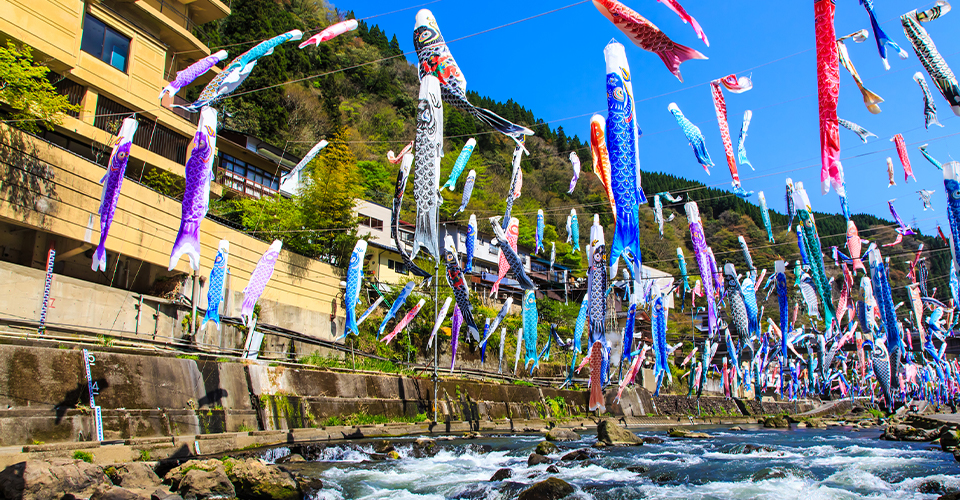 梅林湖から流れる杖立川沿いにある杖立温泉。弱アルカリ性の弱食塩泉で泉質が良いため、湯治目的に足を運ぶ人も多い温泉地です。源泉が98度という高温のため、多くの宿にむし風呂が備わっています。「四季の宿 わかのや」は、そのおもてなしの良さから“一度行くとまた行きたくなる”といわれるほど人気の旅館。泉質の良さから女性客に人気です。宿泊ではなく気軽に家族風呂を満喫したい方は、11種類のお風呂が楽しめる「観音岩温泉」がおすすめ。開閉できる天井を開いて、川のせせらぎを聞きながら日常の疲れを癒してみてはいかがでしょう。毎年4月上旬~5月上旬に開催される鯉のぼり祭りでは、杖立川の上空を優雅に泳ぐ色鮮やかな鯉のぼりも楽しめます。