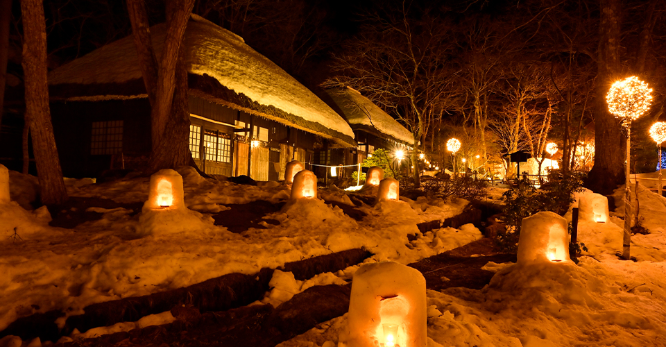 湯西川の渓流沿いに旅館や民家が並ぶ、湯西川温泉。壇ノ浦の戦いで敗れた平家の落人が、出湯で傷を癒やしたという伝説が残っています。おすすめの観光スポットは、落人伝説を伝える「平家の里」。この地方に伝わる伝統芸能や民芸品などを、豊富な展示資料から学ぶことができます。宿泊は「平家伝承かずら橋の宿 本家伴久」へ。広々とした3つの露天風呂は貸し切り利用も可能です。名物の炭火囲炉裏焼き料理も人気。川魚などの山の幸を存分に堪能できます。そして湯西川温泉といえば、冬の風物詩「湯西川温泉 かまくら祭」。河川敷に無数のミニかまくらが並びます。夜になるとかまくらがライトアップされ、温泉街が幻想的なあかりで満たされます。