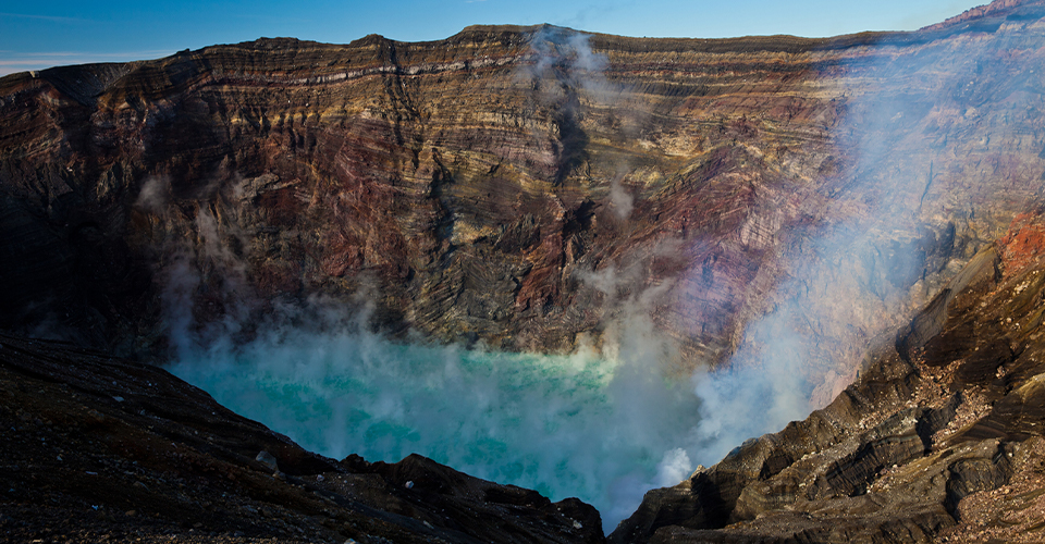 阿蘇山を構成する阿蘇五岳のひとつ「中岳」。阿蘇五岳には中岳のほかに高岳、根子岳、烏帽子岳、杵島岳があります。中岳の標高は1791m、阿蘇五岳のなかでも火山活動が最も活発で、噴煙が上がっており、硫黄の匂いが強め。運が良ければ、白い煙の中から、美しいエメラルドグリーンの火口湖を見ることができます。中岳の火口西の展望所まではロープウェーで来ることができましたが、現在は運行が中止され、シャトルバスでの移動となっています。展望所とは反対側の東側からのルートが登山道となっており、歩いて雄大な景色を眺めながら中岳火口を目指すのもおすすめです。ガス発生などによる立入規制もあるので訪ねる場合はご注意を。