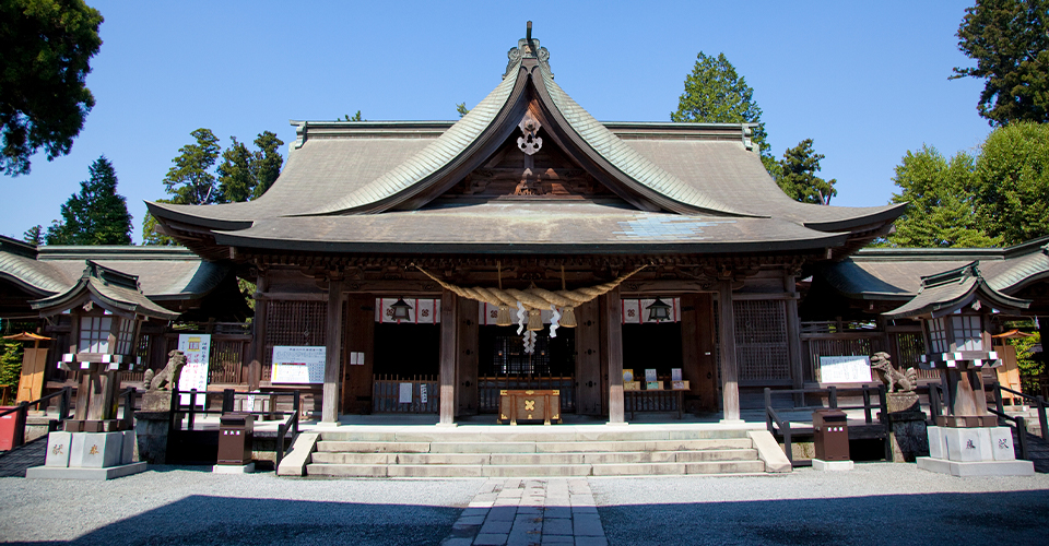 活火山・阿蘇山を有する熊本県は「火の国」と呼ばれ、火山が噴火する様子から神々が宿る場所として崇められてきました。熊本県の阿蘇神社も、古来、阿蘇山火口をご神体とする火山信仰と融合していました。阿蘇の開拓をつかさどる祭神・健磐龍命(たけいわたつのみこと)をはじめ、家族神12神を祀っています。その歴史は古く約2,000年。日本三大楼門に数えられる重厚な大楼門や阿蘇の火祭りのひとつ「火振り神事」が有名です。阿蘇神社で参拝客が多く見られるのが、願掛け石と縁結びの松。願掛け石は3回なでて願い事をする、縁結びの松は、男性なら左から2回、女性なら右から2回まわるとご利益があるといわれています。