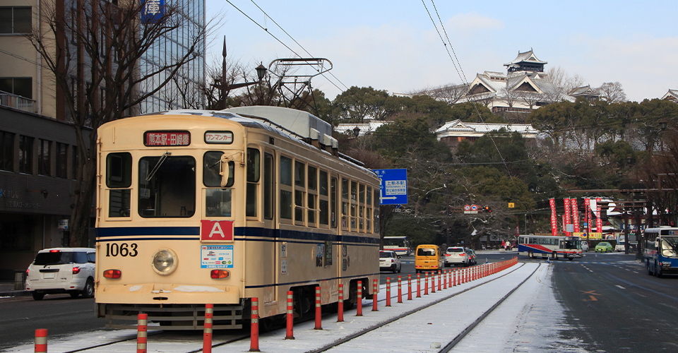 熊本市電は、大正時代に開通し熊本市民に長く親しまれてきた路面電車。運賃が市内一律で分かりやすく、全国の交通系ICカードが利用可能です。熊本駅を始め、熊本城やアーケード街など、主要観光地への移動手段としても便利。熊本市交通局や、熊本駅総合観光案内所などで販売している1日乗車券を利用すれば500円(モバイルチケット/2025年9月現在)で乗り放題なので、熊本観光には欠かせませんね。オススメは、熊本城に近い「新町」周辺地域。城内町として栄えた新町は、今でもレトロな建築物が残り、風情ある雰囲気を楽しめます。熊本市電に乗車して、ゆっくりと眺めるのにぴったり。熊本市電で、一味違ったのんびりとした観光を楽しんでみてはいかがでしょうか。