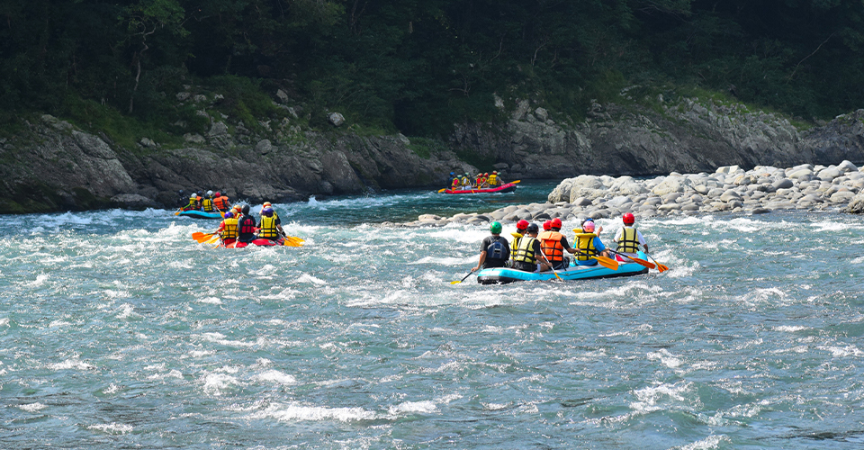 熊本県南部を流れる日本三大急流のひとつ「球磨川(くまがわ)」。雄大な自然を眺めながらのんびり舟下りもいいですが、球磨川の急流を活かしたラフティングも人気のアクティビティです。大迫力の急流下りはもちろん、岩場からの飛び込みなどもありスリル満点。球磨川のラフティング会社は約20社(2025年9月現在)あり、半日~1日コースの料金相場は7,000円~11,000円。服装は濡れてもいいものを用意するのが良いでしょう。基本的にロングジョンウェットスーツやライフジャケット、防寒用ジャケットはラフティング会社のほうで用意しています。夏は少し暑いですが、ケガ防止のためにウェットスーツの着用をおすすめします。