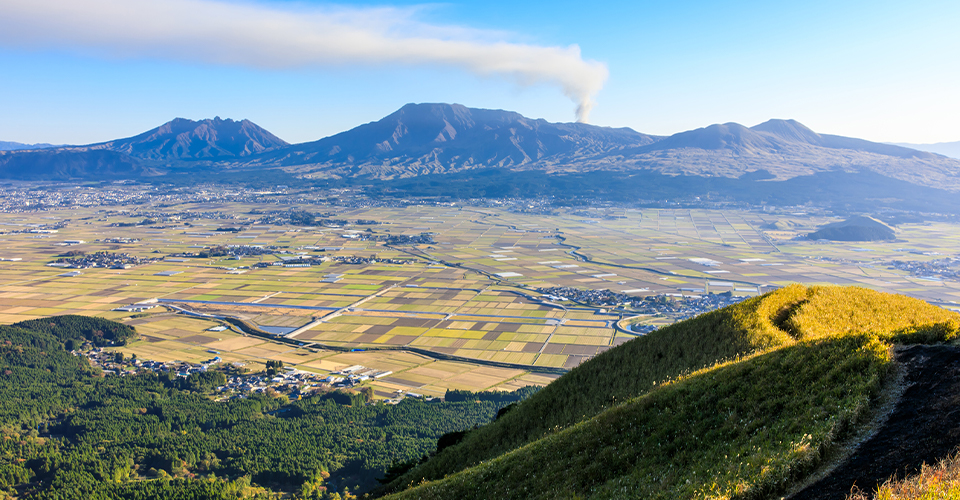 九州中央部に位置する活火山・阿蘇山。正式には、阿蘇五岳(高岳・中岳・根子岳・烏帽子岳・杵島岳)の総称が阿蘇山と呼ばれています。「カルデラ」が形成されており、これは世界的に見ても規模が大きく、この中に街があり人々の生活が営まれているほど。ここに来たら訪ねたいのが、阿蘇を見渡せる大観峰。阿蘇中岳火口から上がる白煙も迫力満点。ロープウェイ代行バスの阿蘇山火口シャトルで火口の見学も可能です。それとは対称的に、馬が草を食む牧歌的な風景が広がる草千里ヶ浜ではのどかな雰囲気を楽しむことができます。周辺には、火山の恩恵を受けた栃木温泉や阿蘇内牧温泉などもあり、旅の疲れを癒すのにおすすめです。
