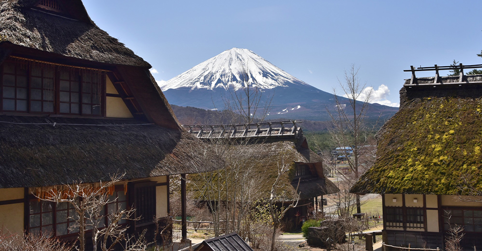 西湖の西北に位置する西湖いやしの里根場は、約20棟の古民家を復元した観光集落です。今では珍しい水車小屋をはじめ、富士山を背にかやぶき屋根の家々が軒を連ねるさまは、まさに日本の原風景といえるでしょう。それぞれの建物が、ほうとうや郷土料理が味わえる食事処、地場産品の販売所、陶芸体験ができる工房、資料館、ギャラリーなどになっており、お好みの過ごし方を楽しめます。4月中旬~5月上旬に見ごろを迎える桜、10月下旬~11月中旬の紅葉と四季折々の風景も魅力。美しい富士山の姿とともに、古きよき日本の風景をお楽しみください。