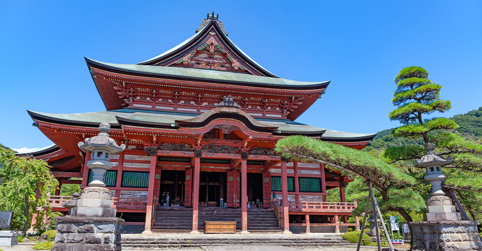 1558(永禄元)年、川中島の合戦で信濃善光寺の焼失を恐れた武田信玄が、御本尊善光寺如来をはじめ諸仏寺宝類を奉遷したのが始まりという甲斐善光寺。1598(慶長3)年に御本尊が信濃に帰座されたあとは、善光寺如来の前立仏が新たな御本尊とされ、以降甲斐の国・山梨を代表する名刹として広く崇敬を集めてきました。壮麗な堂塔伽藍を構え、東日本最大級の木造建築として名高い金堂、重層建築の山門などが重要文化財に指定されています。金堂下の真っ暗な通路では、鍵に触れることで御本尊と縁が結ばれる「お戒壇廻り」を体験することができます。御朱印は御本尊の「善光寺如来」と揮毫されたもの。
