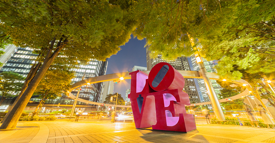 新宿西口にある「新宿アイランド」はオフィス、学校、店舗、広場などの機能を併せ持つ高層ビルです。「LOVEオブジェ」はビルの正面にあり、待ち合わせ場所や写真スポットとして人気です。高さ約3.5m、正方形の赤いオブジェで、アメリカ人の芸術家・ロバート・インディアナが制作を手掛けました。手をつないでVとEの間を通ると、恋が成就すると言われています。ビル周辺には、大理石の橋や星を模した舗道の彫刻等、アーティストの作品が点在しています。