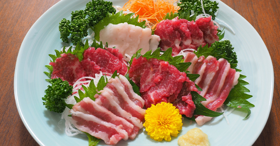 切り口が桜色になることから桜肉といわれ、天下の武将加藤清正公が広げた熊本の馬肉料理。滋養強壮、薬膳料理としても県民に愛され、馬肉料理は熊本が誇る食文化と考えられています。馬肉専門店菅乃屋ではミネラル豊富な牧草と名水に恵まれた阿蘇の牧場でじっくり育てられた新鮮な馬肉が供されます。馬肉料理の本場ならではの一頭余すところない様々な部位を、刺身や石焼き、鍋、しゃぶしゃぶと多彩な料理でご賞味いただけます。