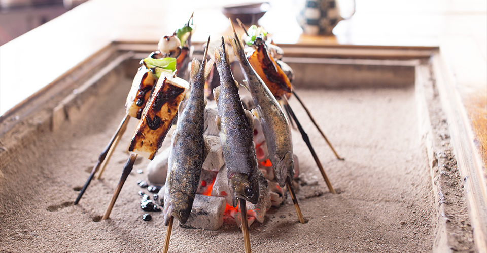 田楽は昔から食べられている歴史ある郷土料理。農家の五穀豊穣を祈願した田楽舞いという踊りに由来します。地元特産のいもを主としてヤマメ、山菜を織り混ぜ、独特の山椒味噌、ゆず味噌で味付けした素朴な味わい。定食メニューには田楽とだご汁、きびめしなどが付いた「田楽定食」など数種類のセットメニューを揃えています。雑木林に囲まれた閑静なかやぶき民家「高森田楽の里」で昔ながらの囲炉裏を囲み、炭火で焼いた高森田楽をお楽しみください。