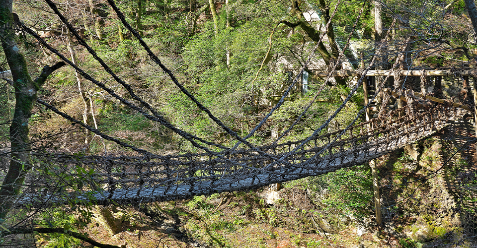 秘境祖谷にある「祖谷のかずら橋」は、シラクチカズラと呼ばれるつる植物で作られた吊橋です。重要有形民俗文化財に指定され、3年ごとにかけ替えられています。足場となる木の間隔が広く、その隙間からは遥か14m下に流れる祖谷川が見えます。踏み出そうとすると橋がゆらゆらと頼りなく揺れるため、スリル満点です。また、毎日19:00〜21:30にライトアップが行われており、幻想的な景色を眺めることができます。