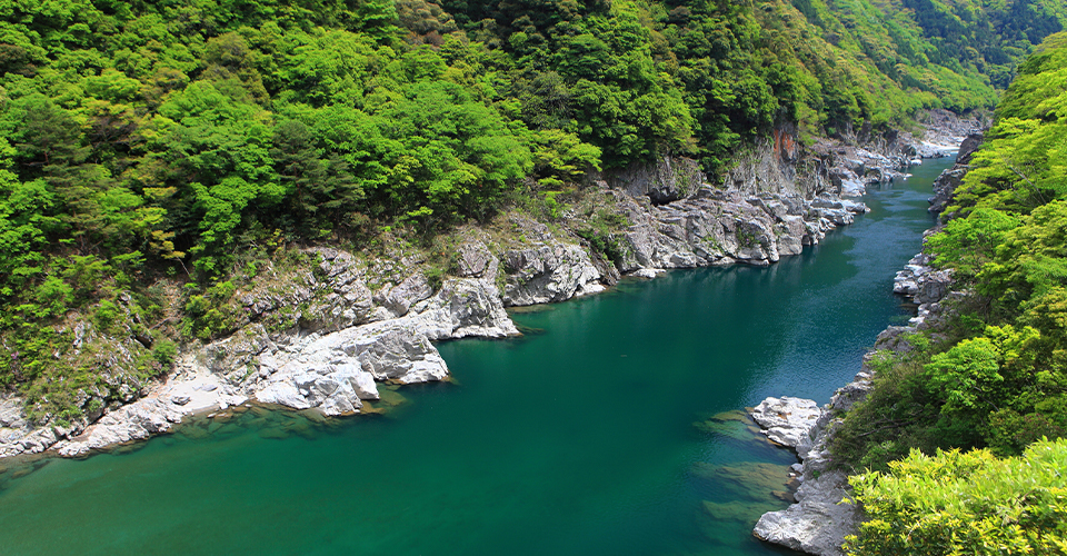 大歩危・小歩危(おおぼけ・こぼけ)は、吉野川の激流で2億年の時をかけて創られた約8kmにわたる渓谷です。名前の由来は、「大股で歩くと危ないから大歩危」、「小股で歩いても危ないから小歩危」という説があります。小歩危と大歩危の間は、歩いて景色を楽しむことができ、11月中旬から下旬にかけて、鮮やかな紅葉が見られます。「日本一の激流」と呼ばれる世界有数のラフティングの名所でもあり、インストラクターに教わりながら体験可能です。