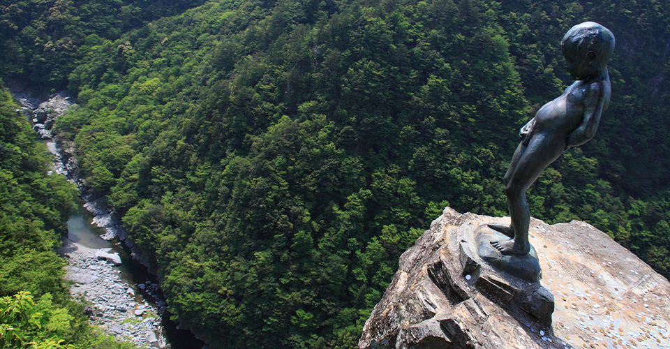 小便小僧像は、1968年に徳島県の彫刻家である河崎良行氏によって作られました。七曲りの谷底から200mの高さの岩の上に、この像は立っています。その昔、祖谷街道工事の作業員や旅人たちが、像のある岩のあたりで小便をして度胸だめしをしていたことが由来となり、像が設置されました。渓谷をのぞくと青く輝く祖谷川が見え、秋には色鮮やかな紅葉を楽しめます。目がくらむような高さに一人たたずむ小便小僧の姿は、一見の価値ありです。