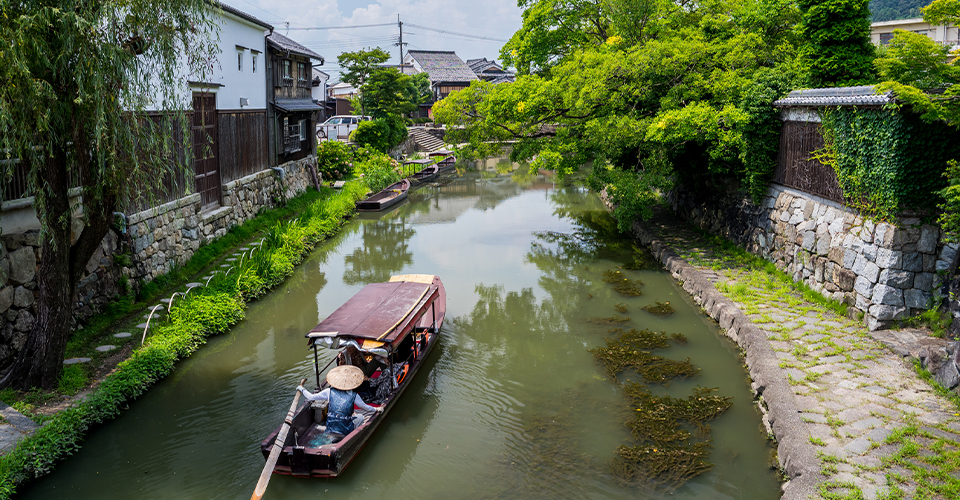 八幡堀や水郷めぐりで有名な近江八幡市。白壁土蔵や豪商たちが築いたお屋敷、石垣の景色など、まるで数世紀前から時間が止まっているかのような風情ある街並みが広がっており、散策が楽しい観光名所です。
