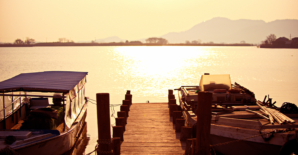 かつて織田信長が築城した安土城の近くにある湖です。現存する琵琶湖の内湖では最大の面積を誇ります。元々昭和17年までは安土山から北は琵琶湖と繋がっていました。ヨシ群を主体とする湿地には、動植物が多く確認され、ラムサール条約にも登録されています。水郷めぐりでは、群生するヨシの間を屋形船でゆっくりと進みます。春には美しく咲き誇る桜が、秋から冬にかけては枯れながらも風情のあるヨシ群を見ることができます。