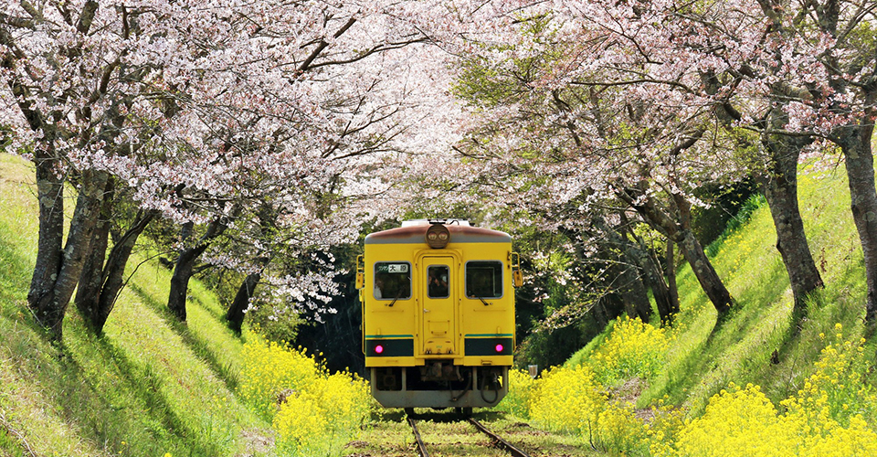 大原駅(いすみ市)から上総中野駅(大多喜町)を結ぶローカル線です。房総半島の半分を横切るように走っており、のどかな風景を見ながらのんびり電車の旅を楽しめます。毎年3月上旬~4月上旬には、鉄道沿線の約15kmにわたり菜の花が咲き誇ります。さらに4月には桜も花開き、列車と菜の花と桜のコラボレーションを楽しめます。