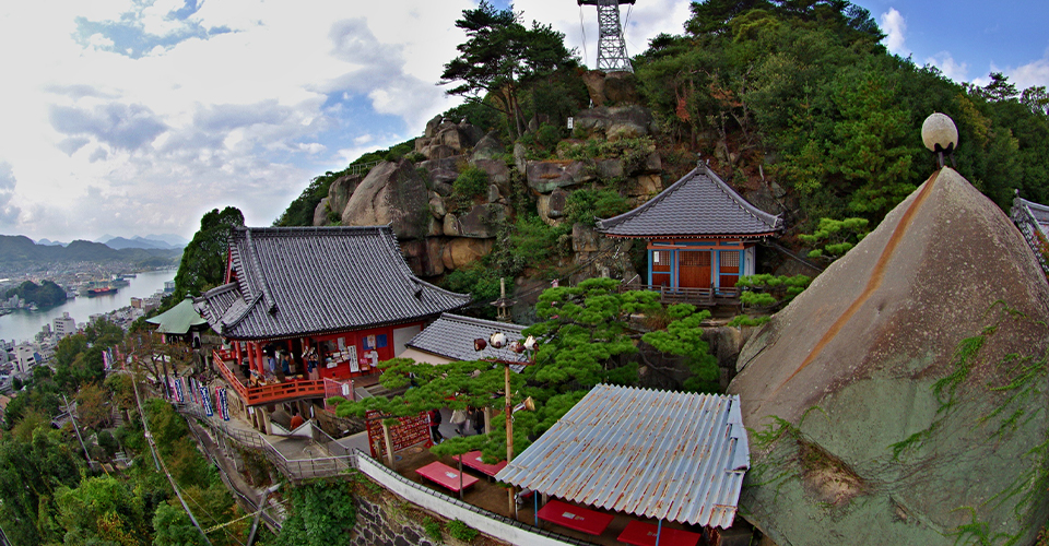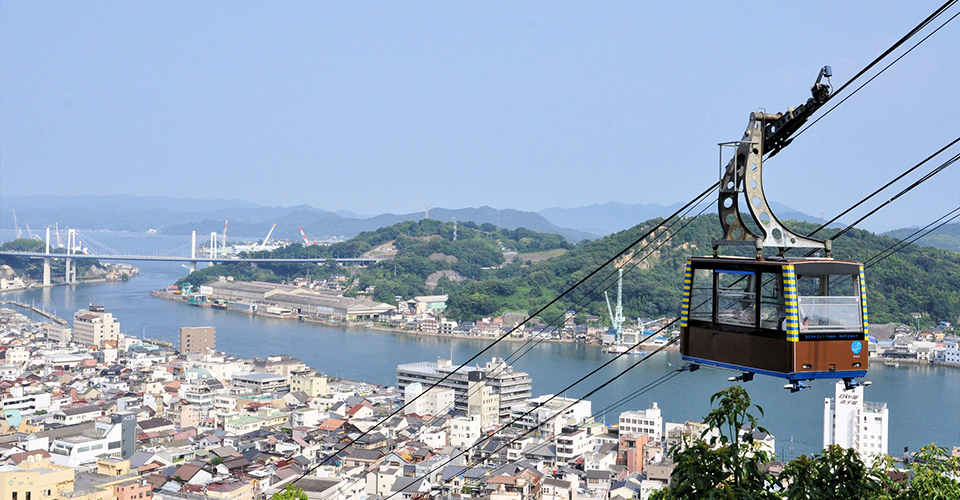 「千光寺山ロープウェイ」は、尾道市街地と千光寺山を3分で結ぶロープウェイです。車窓からは、「艮神社」「天寧寺」「千光寺」等の歴史ある建造物や尾道の街並み、尾道水道などの景色をガイドの案内とともに確認できます。ペットもキャリーバッグに入れて乗車できます。展望台からは尾道の市街地と瀬戸内海を一望でき、天気のいい日は遠くに四国連山も見られます。