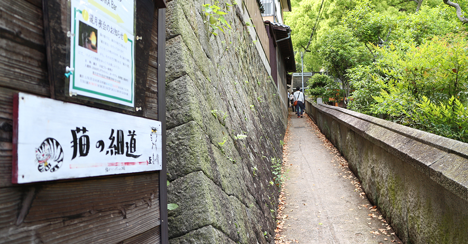 猫の細道は「艮神社」から「天寧寺 三重塔」まで続く約200mの細い路地です。尾道出身の作家・園山春二が「福石猫」を置き始めたことから、この愛称が付けられました。福石猫とは、丸い石に猫の柄を描きお祓いをした石のことで、大きさや柄はすべて異なります。路地にはカフェ「梟の館」や看板猫がいる雑貨店「Le chat」があり、一休みしたりお土産を購入できます。歩いて5分の場所にある「宝土寺」では、猫のハンコが押された御朱印をいただけます。