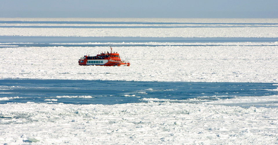 北海道オホーツク海沿岸では、冬季に砕氷船「ガリンコ号」「オーロラ号」で、流氷観光を楽しめます。紋別市のガリンコ号は、船首の2本のドリルで氷を砕きながら進む方式で、氷を割る音や振動が体に伝わる迫力が特徴です。船内は暖房が完備されており、快適に約60分の航行を楽しめます。タイミングが合えば、アザラシや天然記念物のオオワシなどの野生動物を観察できるかもしれません。網走市のオーロラ号は、船の重みで氷に乗り上げて砕く仕組みで、厚さ1mの流氷を割り進む様子をデッキから眺められます。大型船と小型船があり、所要時間は約1〜2時間です。