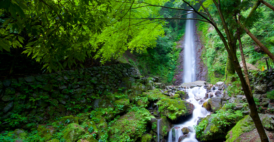 養老町のシンボルであり、日本の三名瀑に数えられている養老の滝。高さ約30m、幅が約4mあり、岩角を打って流れ落ちる水は清らかで、砕け散る飛沫が霧のように立ち込めており、幻想的な雰囲気が漂います。10月から11月にかけては、鮮やかに色づいたカエデやイチョウが滝の周囲を彩り、絵画のような光景が見られます。養老の食材にこだわった料理が味わえる旅館「遊季の里」で、自然に囲まれた優雅な一日を過ごすのもおすすめです。