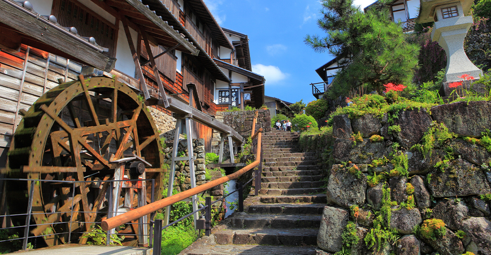 江戸時代初期に開通した五街道の一つの「中山道」が通る「馬籠宿(まごめじゅく)」は、里山風景が楽しめる宿場町として有名です。石畳の坂に沿って瓦屋根の土産物屋や食事処が立ち並び、名物の「おやき」や「五平餅」等の食べ歩きも楽しめます。自然主義文学を代表する作家、島崎藤村が生まれ育った地としても知られており、生家跡に建設された「藤村記念館」では、名作「夜明け前」や「嵐」の直筆原稿や遺愛品が展示されています。