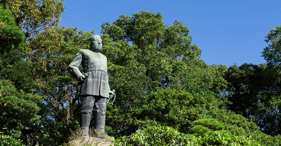 「西郷隆盛銅像」は、没後50年祭記念で造られた高さ約8mの銅像です。渋谷「忠犬ハチ公」の製作者であり、鹿児島県出身の彫刻家でもある安藤照が製作しました。陸軍大将の制服を着て城山を背景に仁王立ちしている姿は、迫力満点です。道路を挟んで撮影スポットが設けられているので、愛犬のツンの像と一緒に記念写真を撮るのもよいでしょう。周辺には、鹿児島の歴史や文化を学べる施設も充実。鹿児島市立美術館、鹿児島県立博物館などがあります。