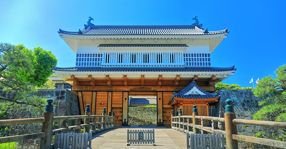 「鹿児島城(鶴丸城)」は、背後の山城(城山)と麓の居館から構成される居城です。1601年頃に島津家の当主であり初代藩主の島津家久が建設に着手しました。居館の正面中央には、2020年に復元された「御楼門」があります。高さ・幅は、共に約20m。江戸時代は、藩の公式行事などのみ通行できましたが、現在は誰でも門を通行できます。日没になると季節に合わせて御楼門と石垣がライトアップされるため、昼間とはまた違った雰囲気を楽しめるでしょう。