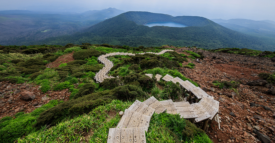 「韓国岳」は、標高約1700mを誇る霧島火山の最高峰です。火口は直径約900m、深さ約300mに達します。山頂から韓国まで見渡せるほど高い山ということから、「韓国岳」と名付けられました。山腹はモミやツガ、アカマツなどの天然林、それより上部はヤシャブシやノリウツギ、ミヤマキリシマなどの低木に覆われています。火口壁では初夏ひかげつつじを鑑賞できるでしょう。近隣の「えびの高原」では、韓国岳の爆裂火口や白紫池、六観音御池、世界でも珍しい「ノカイドウ」などを見られます。
