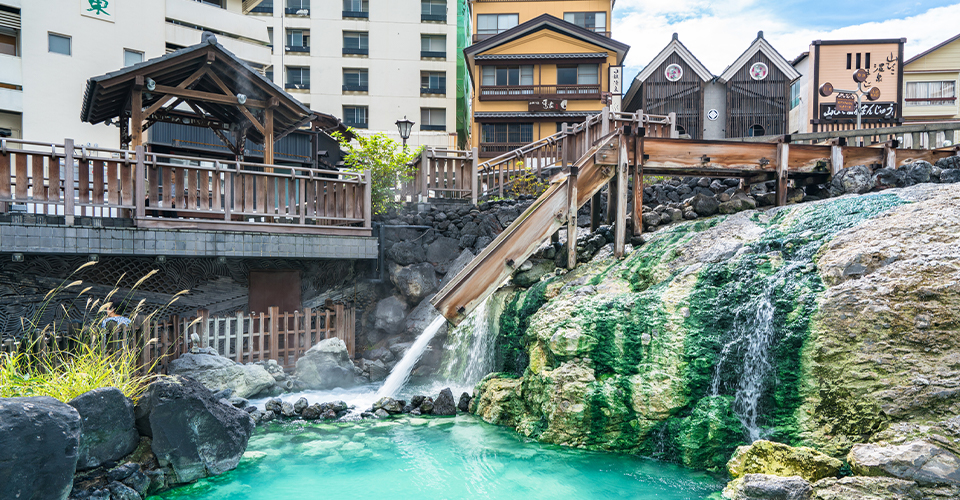 群馬県北西部に位置する日本有数の温泉地です。日本三名泉の一つに数えられ、豊富な湯量と泉質が自慢。温泉街の中心には「湯畑」があり、辺り一面を覆う湯煙から、硫黄の香りが漂います。また、源泉の温度が高いため、木の板を使って温度を下げる「湯もみ」が有名。150軒以上の宿が立ち並び、昔ながらの風情がある旅館から大型ホテルまで、人数や好みに合わせた宿泊が可能です。周辺には「穴守稲荷神社」や「草津白根山」などの観光スポットがあります。