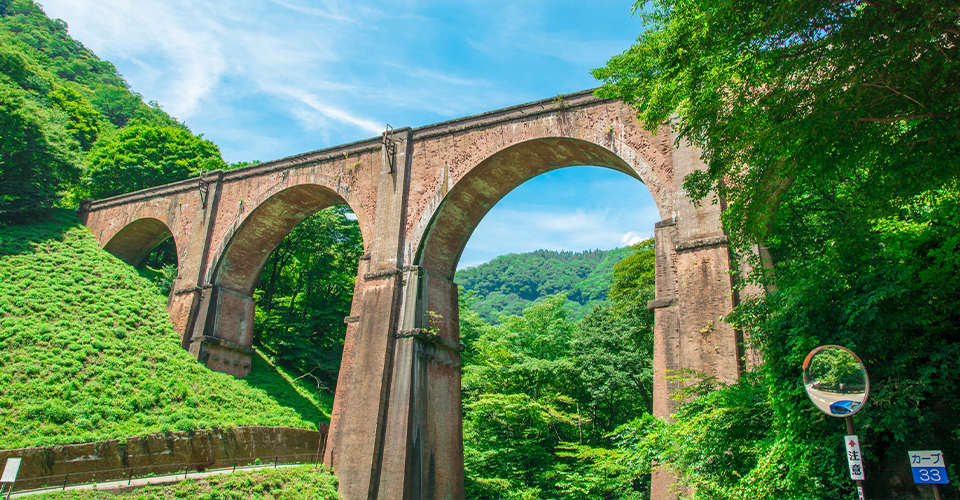 軽井沢の玄関口「碓氷峠(うすいとうげ)」にある鉄道橋です。正式名称は「碓氷第三橋梁(うすいだいさんきょうりょう)」です。美しいレンガ造りのアーチ橋は、圧倒的な存在感。平成5年には国の重要文化財に指定されました。現在、橋の上は遊歩道になっており、ハイキングを楽しめます。例年11月には紅葉が見ごろを迎え、多くの観光客で賑わいます。また、紅葉時期に合わせて期間限定でライトアップが行われ、幻想的な風景を楽しめます。