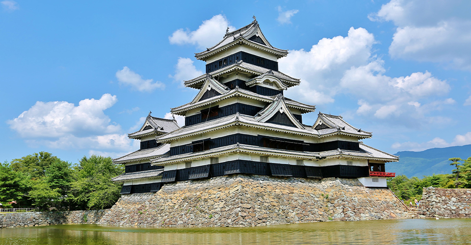 1504年に造られた「深志城(ふかしじょう)」が始まりである「松本城」は、武田信玄や石川数正といった名だたる武将によって統治されてきた歴史あるお城です。見どころは、国宝に指定され、現存する日本最古の五重六階の「天守」。壁面には黒と白の漆塗りが施されており、コントラストの美しい天守が水堀に映るさまは見事です。重厚な黒門をくぐった先にある管理事務所では、登城の記念となる珍しい御朱印「御城印」をいただけます。