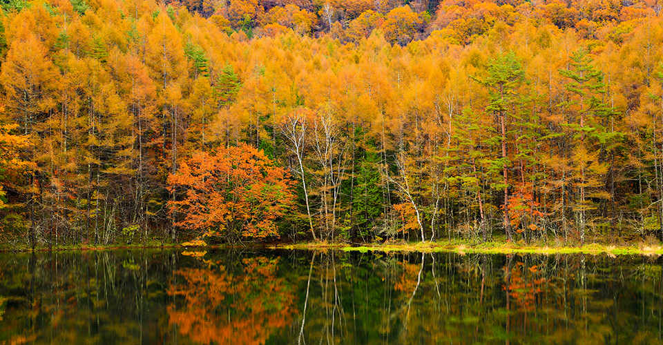 奥蓼科にひっそりと佇む御射鹿池は、鏡のような水面に四季折々の風景を映しだす風光明媚な池です。稲作に利用するために造られた人工的な溜め池で、水質は酸性が強く魚が生息できないため、この澄み切った美しさが生まれました。池を囲むカラマツ林は、春には新緑、夏には深い緑、秋には黄金色に紅葉し、辺りを一色に染め上げます。冬には池を真っ白な雪と氷が覆い、幻想的な銀世界が楽しめます。