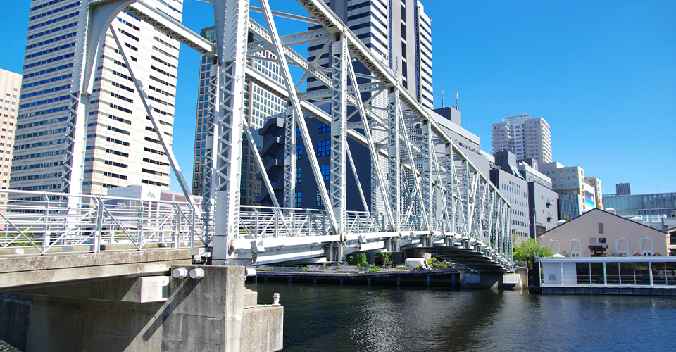 品川区側の天王洲アイルと港区側の芝浦・港南公園を結ぶ歩行者専用の橋。1996年に完成した橋は個性的でレトロな形をしているため、フォトジェニックな橋としてドラマや映画のロケ地にもたびたび使われています。また、夜にはほんのりとライトアップされ、運河の水面に映りこむ橋の光と周囲のビル群が一層美しい光景を作り出しています。天王洲アイル駅から近い割に周辺はとても静かで、隠れ家的なカフェでの食事や散歩など水辺の夜景をゆっくりと楽しみたい人におすすめのスポットです。