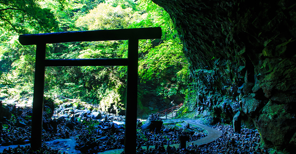 高千穂峡のシンボルとも言える「真名井の滝」は、最も人気があるスポット。約17mの高さから渓谷に落ちる様子は迫力満点です。「天岩戸神社(あまのいわとじんじゃ)」の西本宮は、天照大神(あまてらすおおみかみ)が隠れた天岩戸をご神体としています。その際に八百万の神が集まって対策会議を行ったとされるのが、岩戸川沿いにある「天安河原」。西本宮から徒歩約10分で行けるため、併せて観光するのがおすすめです。高千穂八十八社の総杜「高千穂神社」の社殿は、重要文化財に指定されています。
