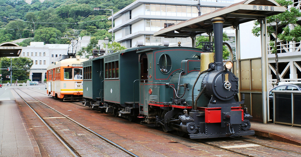 松山市の観光スポットをめぐる「坊っちゃん列車」は、昔ながらのレトロな蒸気機関車の形を模した、観光客に人気の路面電車です。120年以上前に実際に走っていた電車を復元したもので、当時は黒煙を上げながら松山市民の足として活躍していました。夏目漱石の小説「坊っちゃん」にある「マッチ箱のような汽車」という言葉の通り、素敵な木製の内装をしています。松山市駅電停そばの「坊っちゃん列車ミュージアム」には、実物の車両部品や昔使われていた切符が展示されており、坊っちゃん列車の歴史を知ることができます。