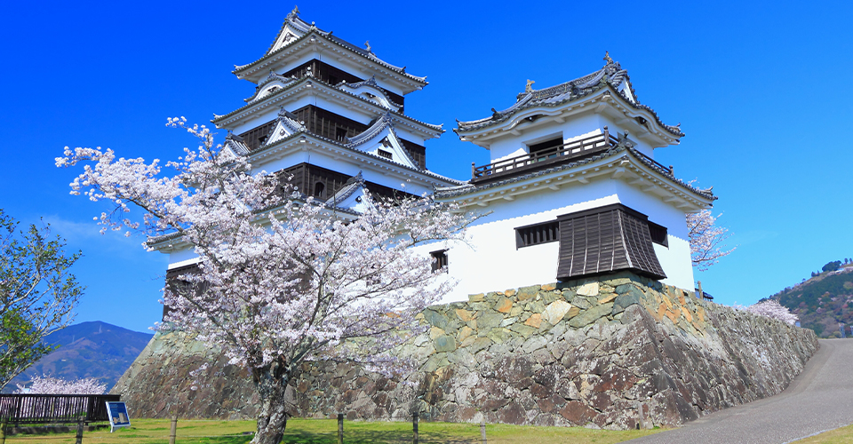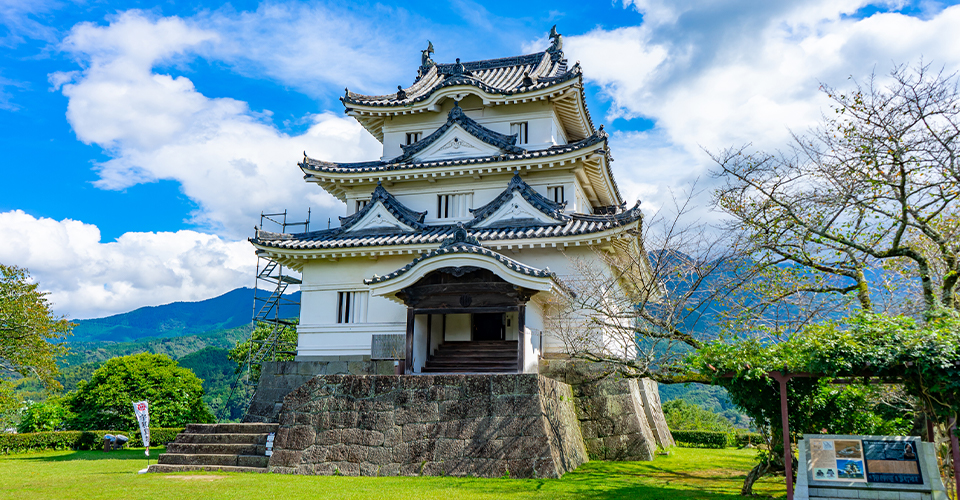 大洲城は、「伊予の小京都」と呼ばれる大洲市にあります。天守は明治21年に老朽化のため取り壊されましたが、明治期の古写真や様々な資料をもとに平成16年に復元されました。当時の技術を利用して、4層4階の天守閣が木造で復元されたのは日本初。大洲城の城域一帯は県の史跡に指定されており、城内に当時の姿のまま残されている4つの櫓は、国の重要文化財に指定されています。大洲城のそばにある「臥龍山荘」や「おおず赤煉瓦館」等と併せて、ノスタルジックな雰囲気を楽しめます。