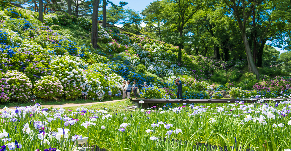 天守閣が建つ本丸を中心とした小田原城跡を整備した公園。園内には、銅門(あかがねもん)や馬出門(うまだしもん)などの史跡のほか、小さなお子さま向けの遊具が備わった「こども遊園地」があり、子供も大人も楽しめます。また、緑豊かな園内では、四季折々の草花を眺めながら、のんびり散歩するのもおすすめ。例年3月下旬~4月上旬には「桜まつり」、6月上旬~7月上旬には「あじさい花菖蒲まつり」が開催され、多くの見物客で賑わいます。
