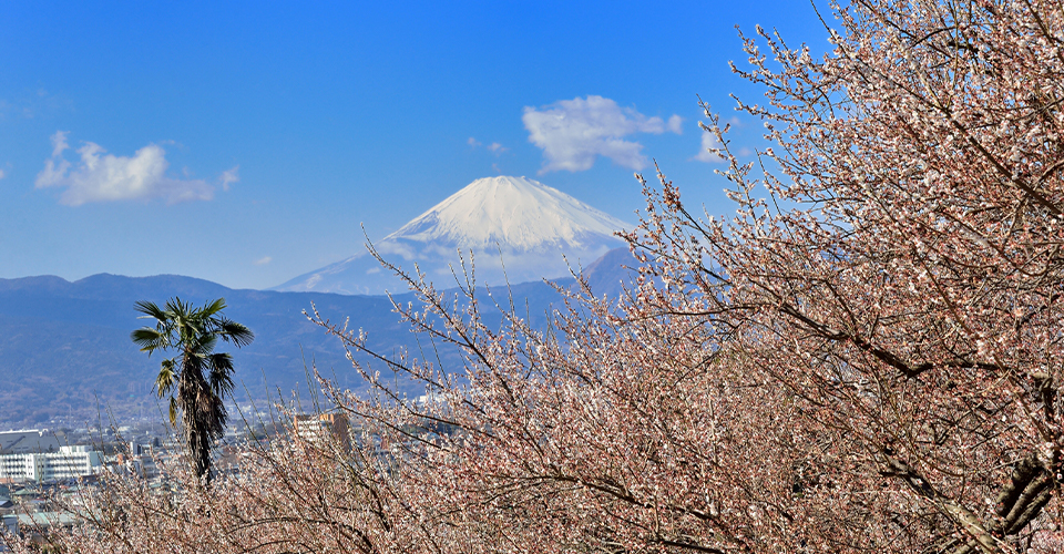 小田原市街から北東に少し離れた場所にある梅林。数多くの品種を栽培しているため、長い期間にわたって梅の花を楽しめるのが特徴。例年2月中旬~3月中旬に見ごろを迎え、約35,000本の梅が一面に咲き誇ります。天気が良ければ、富士山と梅の花のコラボレーションも楽しめます。2月初め~3月初旬に開催される「曽我別所梅まつり」では寿獅子舞などのイベントが行われるほか、食堂や露店などの出店もあり、毎年多くの見物客で賑わいます。