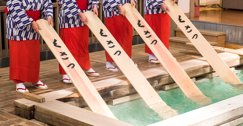 草津温泉街の中心部にある「熱乃湯」は、温泉の湯の温度を下げる「湯もみ」を観賞・体験できる施設です。湯もみは1日6回行われ、民謡「草津節」「草津湯もみ唄」に合わせて踊りと湯もみが披露され、1度の公演につき2回の体験コーナーが開催されます。湯もみ体験は毎週土曜、日曜、祝日の11:30~14:00にも行われているので、挑戦してみてはいかがでしょう。周辺のお土産屋では、湯もみに使う板やご当地キャラクター「ゆもみちゃん」をモチーフにしたお菓子や雑貨を購入できます。