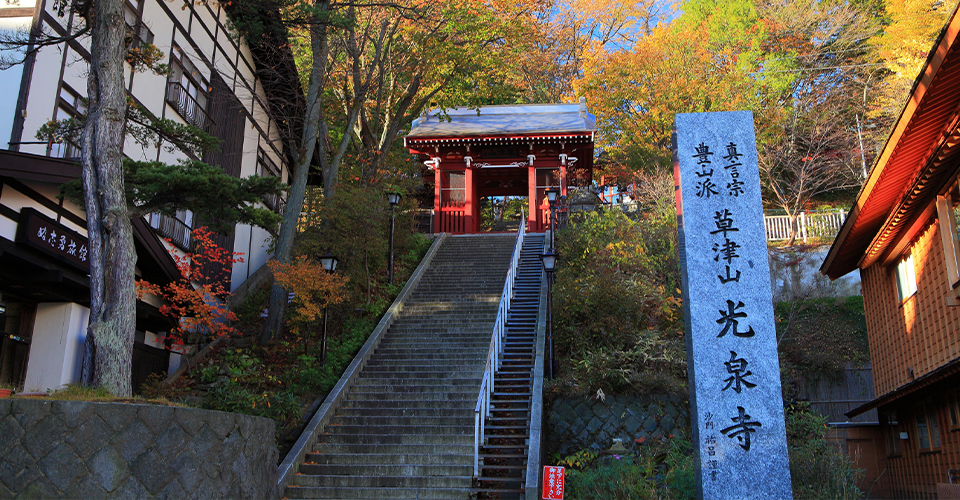 草津温泉中心部の高台にある「光泉寺」は、721年に創建されました。健康長寿、無病息災、開運にご利益があります。御朱印やお守りは社務所でいただくことができ、運を呼び込む「遅咲きお守り」、おみくじとお守りが一つになった「華の筒みくじ」がおすすめです。5月には「花まつり」、大晦日には除夜の鐘が鳴らされます。春から夏の間に不定期で開催されるキャンドルイベント「夢の灯り」では、1,500個以上のキャンドルがふもとから寺院までの階段を照らします。