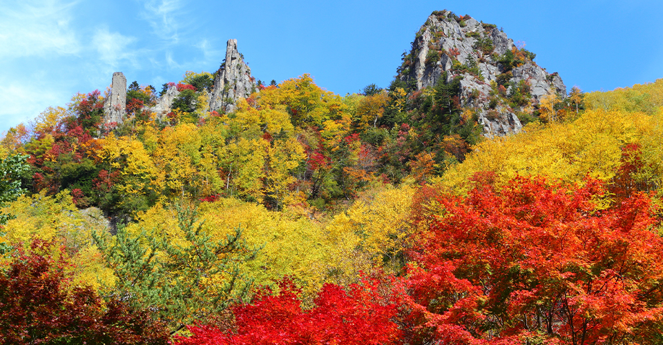 旭岳を主峰とする大雪山連峰のふもとに広がる「層雲峡(そううんきょう)」は、北海道中西部を流れる「石狩川」を挟んで約24kmの断崖絶壁が続く峡谷です。柱状の割れ目のある巨大な岩壁が規則正しく並んだ「大函(おおばこ)」や、標高1,984mの山「黒岳」の紅葉が見どころ。温泉街のある山麓駅から黒岳の5合目までは、ロープウェイに乗って約7分で到着できます。夏は朝6:00から運行されており、運が良ければ雲が眼下に広がり海のように見える「雲海」に出会えます。真夏でも肌寒いため、上着を準備しておくのがおすすめです。