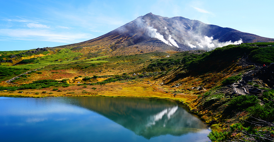 標高2,291mを誇る北海道最高峰の山「旭岳(あさひだけ)」。白くて丸い花びらが特徴の「チングルマ」等の高山植物が美しいことで知られており、アイヌ語で「カムイミンタラ(神の庭)」とも呼ばれています。8月の終わりには段々と山並みが色付き始め、9月には紅葉の見ごろを迎えます。また、冬には無数の氷の粒が陽の光に反射して輝く「ダイヤモンドダスト」という貴重な光景を見られます。旭岳温泉から5合目までロープウェイが出ているため、気軽に散策を楽しめます。