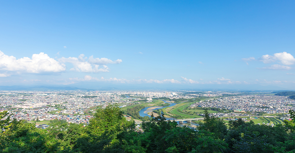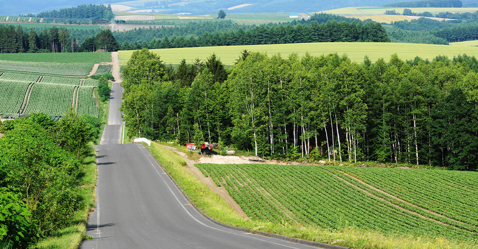 旭川空港から車で約10分の場所にある「就実の丘」は、農地が広がる丘陵地帯です。旭岳や十勝岳連峰、旭川や美瑛(びえい)の街並み等、360度のパノラマビューが見渡せるのが魅力。また、旭川空港から就実の丘までの道のりが、ジェットコースターのようなアップダウンやカーブが多いことで知られています。北海道らしい澄んだ青空と大地を眺めながらドライブを楽しめます。先が見えないほどの急勾配の坂が多いため、運転には注意が必要です。