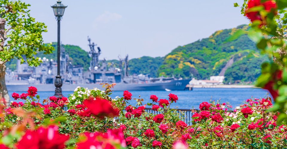 横須賀港に面する「ヴェルニー公園」は、横須賀の造船技術に貢献したフランスの造船技師、フランソワ・レオンス・ヴェルニーの功績を称えて整備されたフランス式庭園です。見どころは、約130品種・1,300株の色鮮やかなバラが咲く花壇。毎年5月と10~11月の見ごろの時期には、音楽の演奏会やフリーマーケットが楽しめる「ローズフェスタ」が開催され、多くの人で賑わいます。
