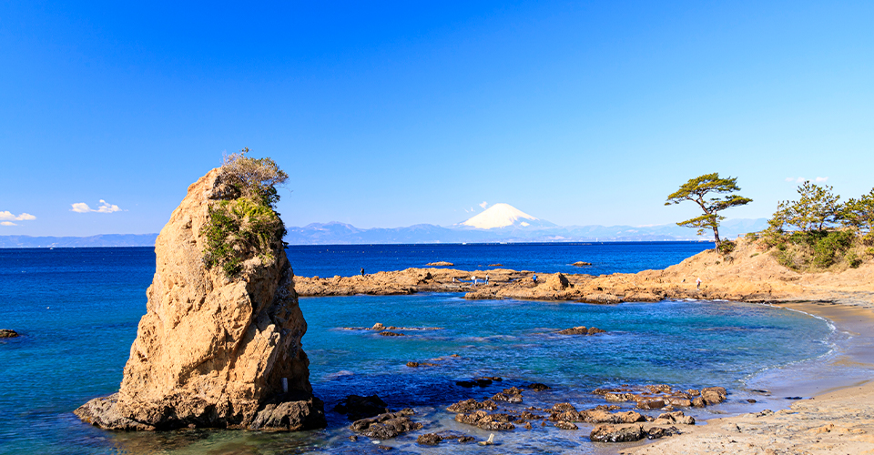 横須賀の西端にある「立石公園」は、相模湾の波打ち際に突き出した高さ約12m・周囲約30mの奇石「立石」をシンボルとする景勝地です。海越しの富士山と、自然が作り出す緩やかな海岸線が美しい絶景スポットとして知られています。特に夕日が相模湾と立石を染め上げる夕暮れ時に訪れるのがおすすめ。浮世絵師の歌川広重が「相州三浦秋屋の里」と題して描いたほど、趣のある景観が広がります。園内の至るところにスイセンが植えられており、毎年12月から2月にかけて見ごろを迎えます。