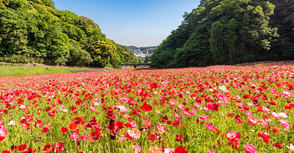 JR久里浜駅からほど近い「くりはま花の国」は、花の名所として有名な緑豊かな公園です。園内にある約2ヘクタールの花畑には、春にはポピー、秋には約100万本のコスモスが咲き誇ります。ほかにも、高さ約10mのゴジラの滑り台が目玉の遊び場「冒険ランド」や、ボルダリングやエアーライフル等のアクティビティがあり、自然の中で思い切り体を動かせます。ランチには、久里浜の新鮮な海の幸が楽しめるレストラン「うおくに」がおすすめです。