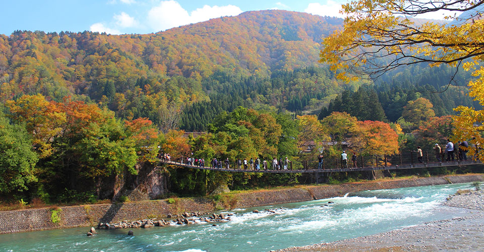村営せせらぎ公園駐車場から合掌造り集落へ向かう間に流れる庄川に掛る歩道橋で、全長100mを超える吊り橋です。橋の上からは庄川と大自然の山々がご覧いただけます。