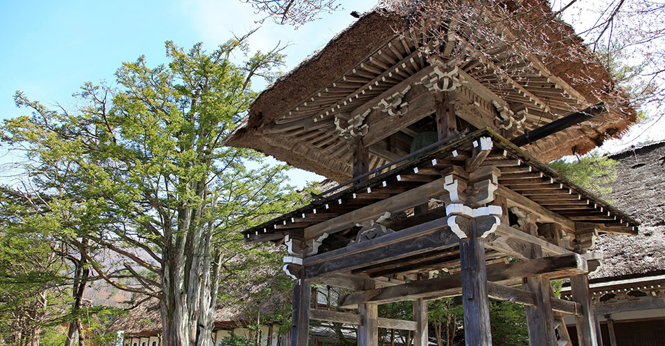 明善寺は浄土真宗大谷派の寺院で、本堂・庫裏・鐘楼門が合掌造りになっています。鐘楼門は、享保元年延べ人数1400人以上を要して建てられたと伝えられ、屋根は茅葺きで、1階に板庇をつけた珍しい造りをしています。梵鐘は第2次世界大戦中に供出され、戦後に設置されました。