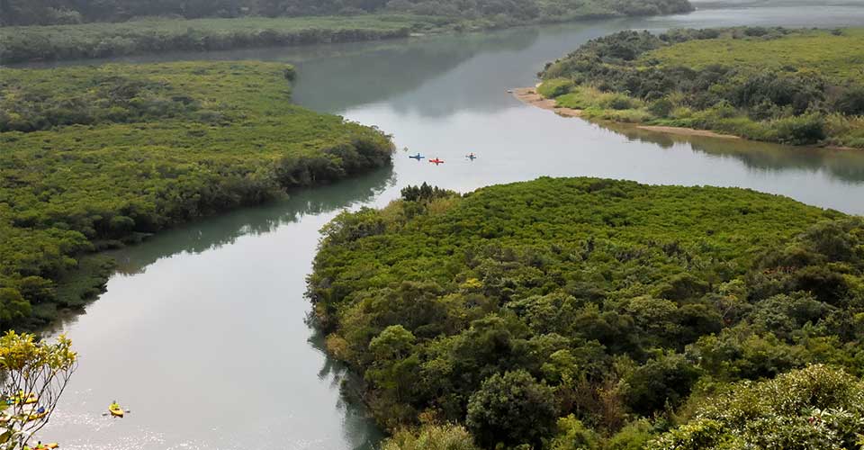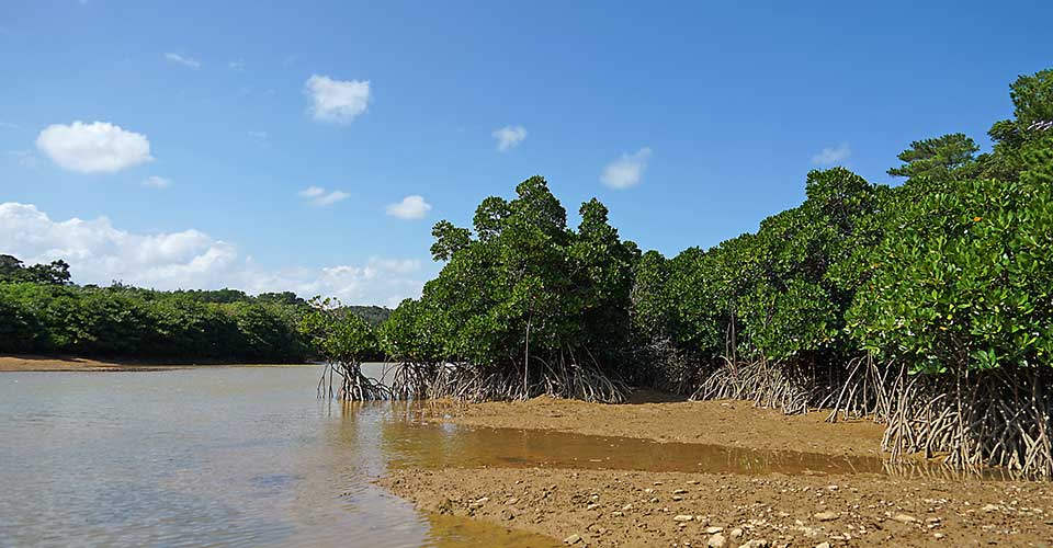 やんばる国立公園の、沖縄本島最大規模のヒルギ(マングローブ)林で国指定天然記念物です。ここではヒルギ、メヒルギ、ヤエヤマヒルギの3種を見ることができます。