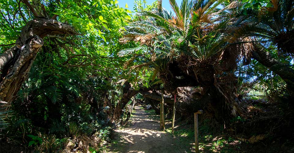 樹齢約300年~350年のソテツでできた自然のトンネルです。もともとは畑の境界線と防風のために植えられたそう。約200メートルのソテツトンネルを抜けると金見崎展望台があり、太平洋と東シナ海を一度に望める壮大なパノラマが広がります。